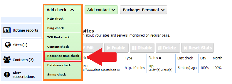 HostTracker poskytuje možnost zkontrolovat reakci vašeho webu. Vyberte Kontrola doby odezvy na hlavní obrazovce: