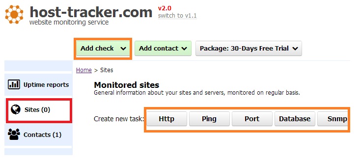 2а. Введите ваши сайты для мониторинга: выберите «Проверка сайта (http)» для базовой проверки. Она загружает HTML-код страницы, измеряет время отклика и может также проверять контент. Javascript и другие скрипты не исполняются.